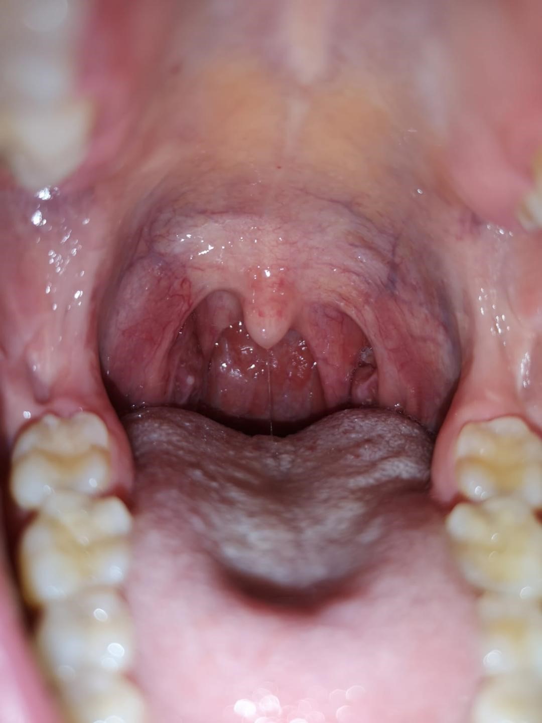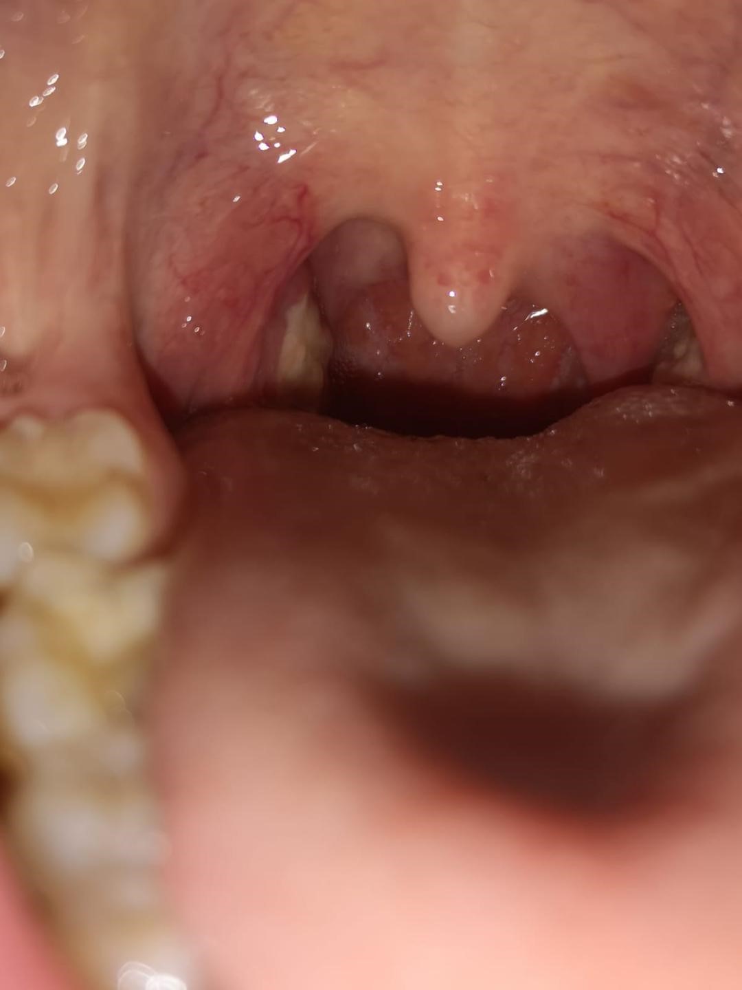 Poza 1- Status 5 zile posoperator ( se remarca prezenta de false membrane la nivelul ambelor amigdale palatine)